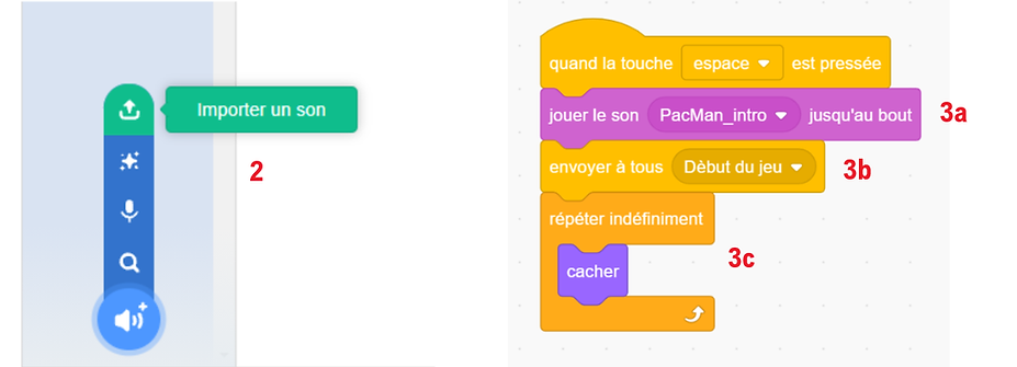 Vous allez importer et créer le code pour les deux autre sprites ("Logo PacMan" et "Appuyer sur espace") qui se montreront aussi sur l’écran au démarrage.